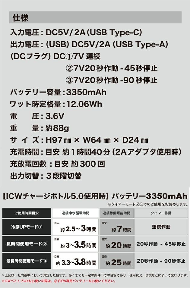 | 入出力(バッテリー):入力:DC5V/2A 出力(USB):DC5V/2A(最大5V/10W) 出力(DC):7.0V(連続)/7.0V(20秒作動45秒停止)/7.0V(20秒作動90秒停止) |