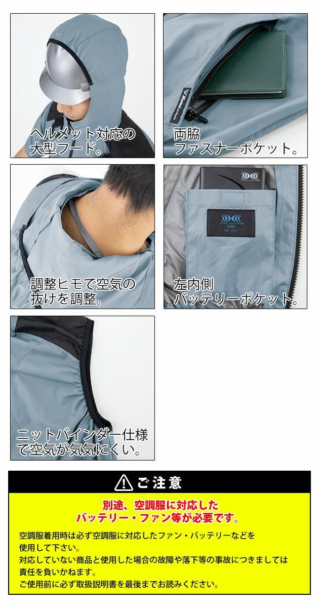 | ※ご使用時の注意※ | ・ファン/バッテリーは別売りです。 ・(株)空調服のバッテリー・ファンを接続してください。 ・炎天下の車内(高温の場所)に放置しないでください。 ・この商品は火気を扱う現場では着用しないでください。 ・必ず付属の説明をお読みいただき、正しくご使用ください。 ・「空調服」は、(株)セフト研究所・(株)空調服の特許および技術を使用しています。 |