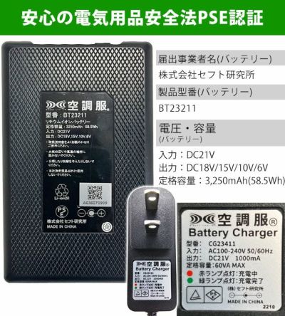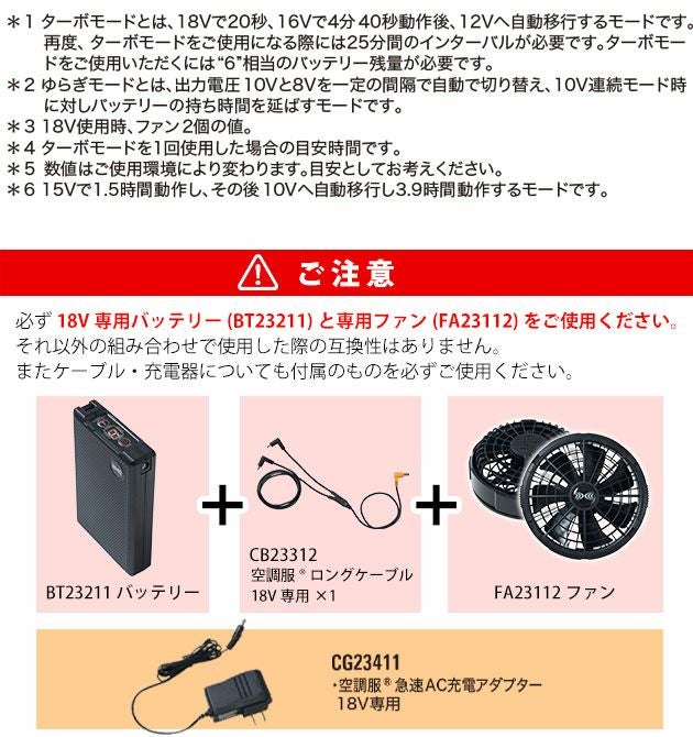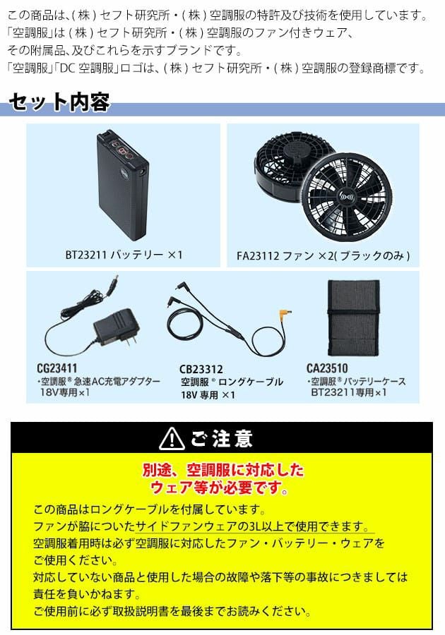 | ご使用時の注意 | ▲ファンFA23112をご使用になる場合は必ずバッテリーBT23211、ケーブルCB23311・CB23312(ロングタイプ)をご使用ください。 それ以外のファンは互換性がありません。 ▲必ず空調服に対応するウェアをご使用ください。 ▲説明書を必ずお読みいただき、正しくご使用ください。 この商品は(株)空調服のバッテリー・ファンに対応しています。 空調服以外のバッテリー・ファンは使用しないでください。 ご使用前に必ず説明書をお読みいただき、正しくご使用ください。 火花が飛ぶ場所で着用する際はファンに火花が入らないようにしてください。 |