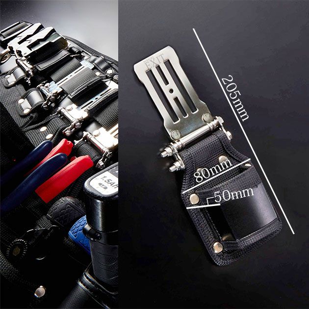| 【特徴】 | EXITハンマー差しにLサイズ登場! 電工ハンマーなどの収納を想定した前作に続き、今回の新作では足場ハンマーなど更に大きめの工具収納が可能。 補強部分にはナイロン生地を採用、独自形状のメタルプレート&連結金具と合わせ、フェイクレザー特有の軽量性、コストパフォーマンスに優れながらも目を惹くポイントに拘ったEXITオリジナルホルダー。 |