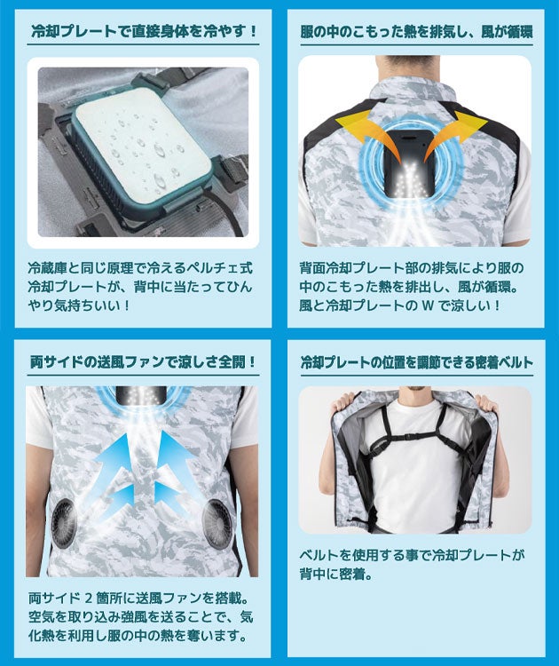 | 【特徴】 | 超ひんやり!最強の冷却システム! 冷蔵庫と同じシステムを応用した夏の作業着!それが「冷蔵服」! 毎年大人気の冷蔵服空2026年モデルが登場! 大型ペルチェと強力ファンのダブル冷却で超涼しい!! ファンとペルチェとバッテリーが全部ついてくる! 届いたらすぐ使えるフルセットです! ◆-19℃の冷却効果!しかもスイッチオン3秒で冷却開始!小型冷蔵庫と同じ大型ペルチェ付き! ◆ペルチェユニットの排熱を効率よく服の外に逃がす完全排気システム! ◆ペルチェが体にフィットしてしっかり冷やす! ◆しかもベスト裏側は遮熱効果の高い全面チタンコーティング! ◆最大風量86リットルの強力ファン付き! ◆付属のPD対応モバイルバッテリー(TH9228)を使えばハイパワーな風に! ◆付属のバッテリーは発火しにくく安全で長寿命なリン酸鉄モバイルバッテリーです! ◆風量は2段階、冷却プレートON・OFF切替可能 ◆簡単に部品を取り外せるので洗濯もOK!(ネットに入れて下さい) ◆バッテリーポケット ◆脇ポケット・ケーブルホール ◆保冷材用メッシュポケット ◆袖周りストレッチバインダーで冷気を逃がさない! ◆左胸ファスナーポケット ◆セット内容 ・ウェア×1 ・ファン×2 ・ペルチェ×1 ・充電ケーブル×1(ACアダプター別売り) ・ファンケーブル |