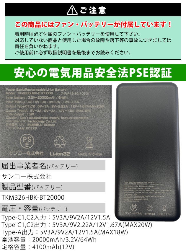 | 【デバイス情報】 | ◆稼働時間 ・ペルチェ+ファン使用時:強 約3時間、弱 約7時間 ・ペルチェのみ使用時:約7時間30分 ・ファンのみ使用時:強 約5時間、弱 約9時間 ◆風量 ・PDモバイルバッテリーTH9228使用時:強 約86リットル/秒、弱 約64リットル/秒(ペルチェON/OFF共通) ◆冷却プレート温度 ・強:環境温度より-10~-15℃ ・弱:環境温度より-5~-10℃ ・ペルチェのみ:環境温度より-15~-19℃ ◆バッテリー情報 ・バッテリータイプ:リン酸鉄リチウムイオンバッテリー ・バッテリー容量:3.2V 20,000mAh(64Wh) ・本体サイズ:約149×69×29mm ・ケーブル:30cm(USB-CtoC) ・重量:400g ・入力ポート:USB-C1,2 5V3A 9V2A 12V1.5V ・出力ポート(USB-C1,2):5V3A 9V2.22A 12V1.67V ・出力ポート(USB-A):5V3A 9V2A 12V1.5V ・充放電回数:約1,000回 ・充電時間(急速充電):12V1.5A 約4時間 ・充電時間(通常充電):5V2A 約6時間 ・定格容量:4,100mAh ・定格電圧:12V ・届出事業者名(バッテリー):サンコー株式会社 ・製品型番(バッテリー):TKMB26HBK-BT20000 ・PSマークの種類(バッテリー):PSE |