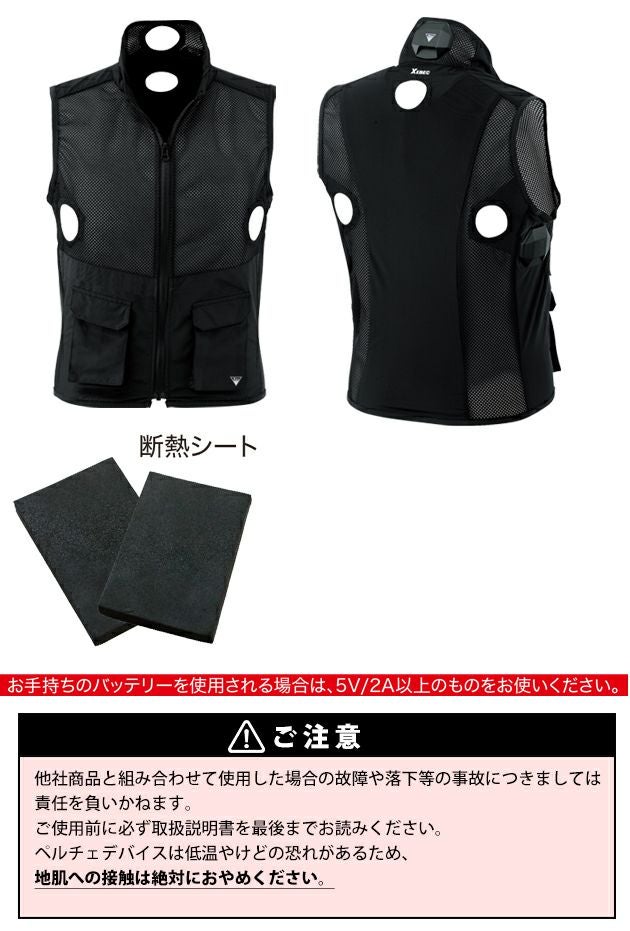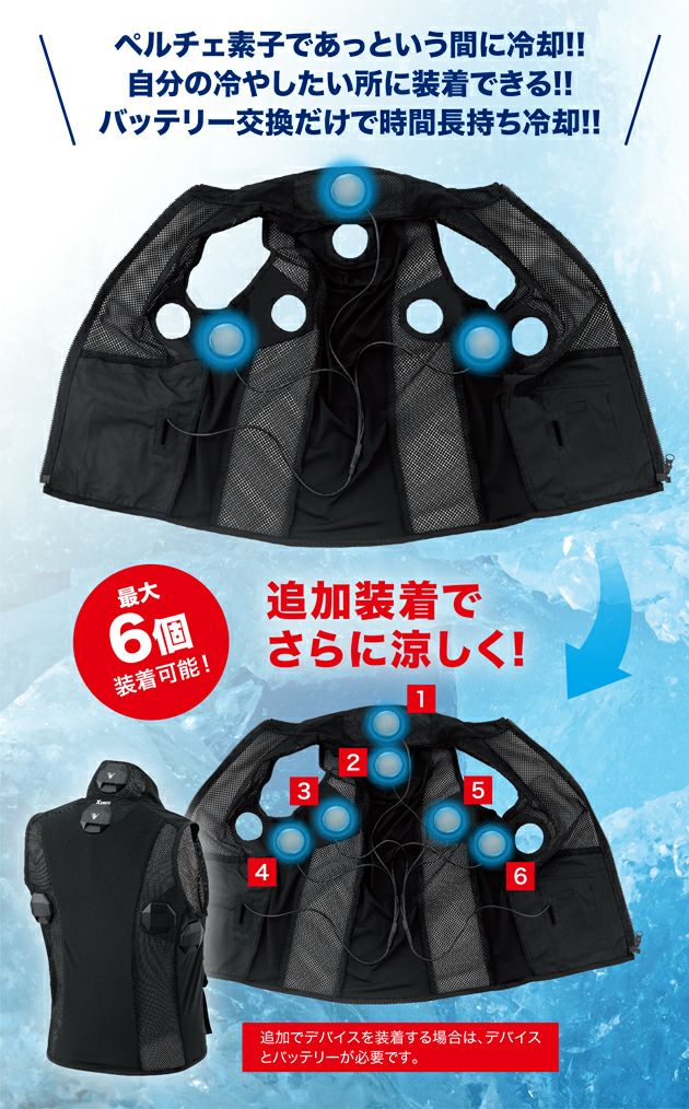 | 【特徴】 | ベストの素材はメッシュとニットで伸縮性が高く着用時のストレスを軽減、さらに身体に密着してひんやり感をアップさせます。 軽量で持ち運びがしやすいためレジャー、アウトドアなどシーンを選ばずご着用いただけます。 ◆両脇にバッテリー、コントローラー収納ポケット付き。 ◆バッテリーの熱が伝わりにくくするための断熱シート付き。 ◆ペルチェ素子で効率的に冷却(最大6つ装着可能) ◆8サイズ展開で様々な体型に合わせて着用 ◆身頃メッシュでムレにくい ◆自分の冷やしたい所に装着できる身体にフィットするストレッチ素材 ◆お手持ちのモバイルバッテリー使用可能 ◆最大6個装着可能!追加装着でさらに涼しく! ※追加でデバイスを装着する場合は、デバイスとバッテリーが必要です。 ◆空調服(R)と組み合わせてさらに涼しく! ※本製品の上から衣類を着用する場合、通気性の悪いウェアを着用すると、排気した熱がこもり、冷却効果が弱まる恐れがあります。 [セット内容] ・ペルチェ専用メッシュベスト×1 ・断熱シート×2 ※お手持ちのバッテリーを使用される場合は、5V/2A以上のものをお使いください。 左右脇ポケット(巾9cm×深さ13.5cm) |