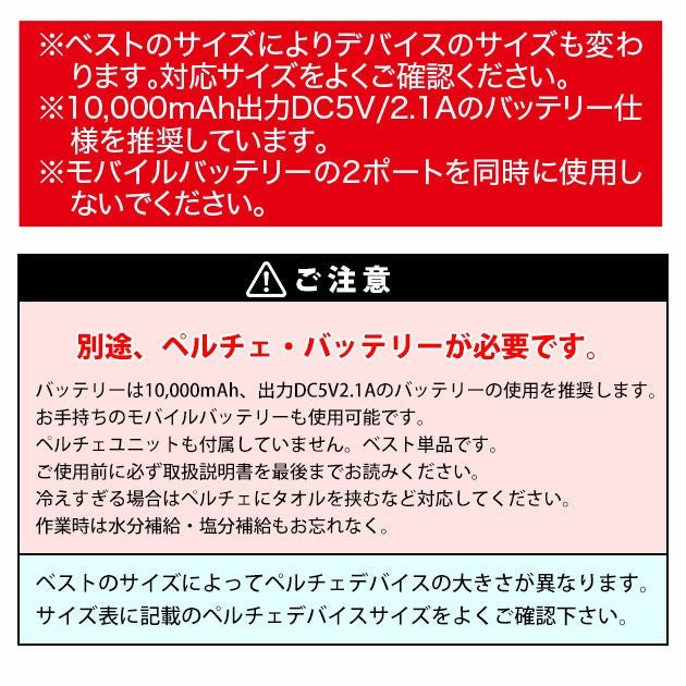 | 【ご使用時の注意】 | ・この商品はベストのみです。バッテリー・ペルチェは別売りです。 ・ベストのサイズによりペルチェのサイズも異なります。 ・お手持ちのモバイルバッテリーでもご使用いただけます。 ・10,000mAh・出力5V2.1Aのバッテリーをご使用ください。 ・モバイルバッテリーの2ポート同時使用はしないでください。 ・取り扱い説明書をお読みいただき、正しくご使用ください。 ・作業時は水分補給・塩分補給もお忘れなく。 |