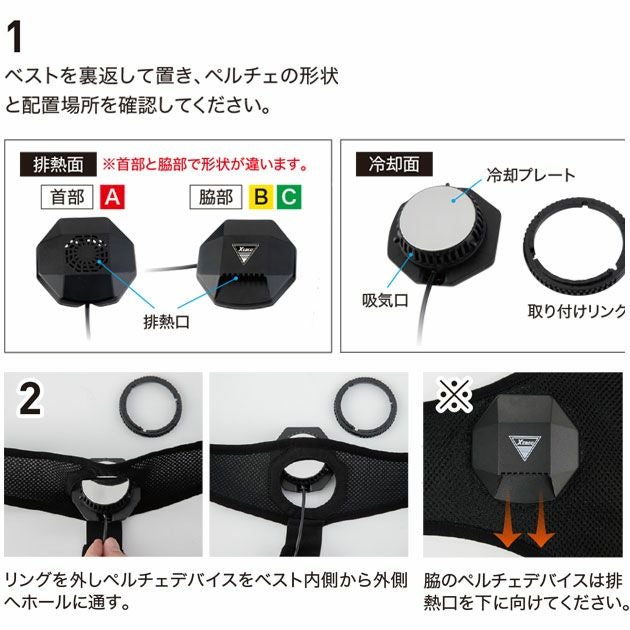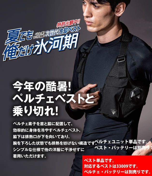 | 【ご使用時の注意】 | ・33008と33009の専用デバイスです。 ・この商品はペルチェのみです。バッテリー・ベストは別売りです。 ・ベストのサイズによりペルチェのサイズも異なります。 ・お手持ちのモバイルバッテリーでもご使用いただけます。 ・10,000mAh・出力5V2.1Aのバッテリーをご使用ください。 ・モバイルバッテリーの2ポート同時使用はしないでください。 ・取り扱い説明書をお読みいただき、正しくご使用ください。 ・作業時は水分補給・塩分補給もお忘れなく。 |