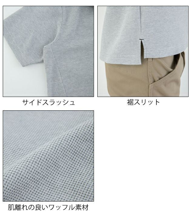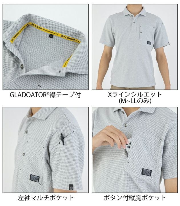 | 特徴 | 通気性があり肌離れの良いワッフル素材を使用。 ものが落ちにくいボタン付き縦胸ポケットや、細身でスタイリッシュなシルエットが魅力。 ◆肌離れの良いワッフル素材 ◆サイドスラッシュ ◆Xラインシルエット(M~LLのみ) ◆GLADIATOR衿テープ付 ◆左袖マルチポケット ◆ボタン付縦胸ポケット ◆裾スリット |