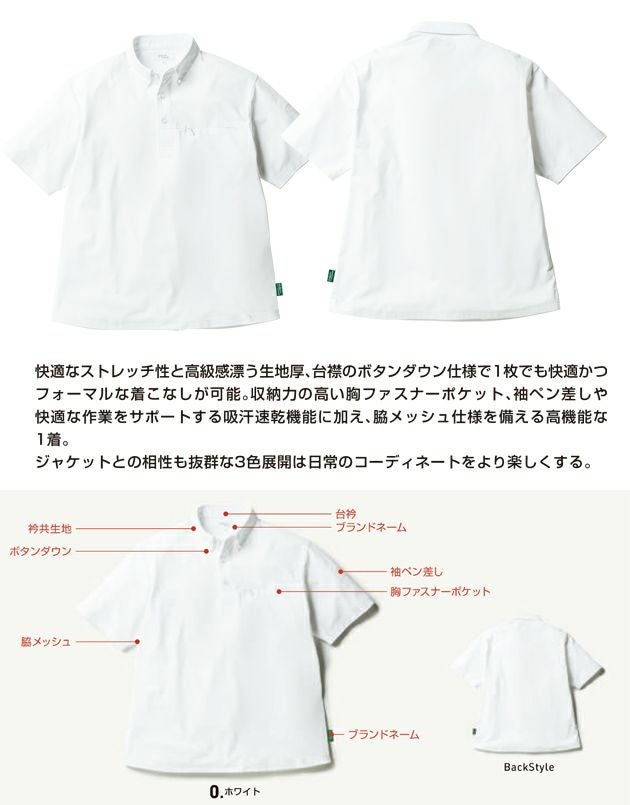| 【特徴】 | 手触りのいいニット素材を使用。快適なストレッチ性と高級感漂う生地厚でどんなシーンでも着用可能。 台襟のボタンダウン仕様とシャツタイプの袖口カフス仕様でフォーマル感が高まり、ジャケットとの相性も抜群。 吸汗速乾機能に加え、脇にはメッシュ素材を使用し快適さもUP。 新時代のニューフォーマルポロシャツで日常をより快適に。 「作業現場でも活躍する、新しいワークスタイルユニフォーム」 1988年にスタートした「Uniform Circus BEAMS」。幅広いお客様の要望にビームスならではのデザイン力と生産ノウハウで応えるユニフォームブランドです。 今シーズンより「桑和」のユニフォームラインナップに「Uniform Circus BEAMS」のアイテムが加わります。 長い歴史と実績を持つユニフォーム製作の知見を活かし、機能性と着心地にこだわりながら、高いデザイン性を併せ持つ新しいユニフォームをご提案します。 ◆ボタンダウン フォーマル感漂うボタンダウン仕様 ◆胸ファスナーポケット 大切な物の落下を防ぐファスナー付ポケット ◆脇メッシュ 不快な蒸れを防止するメッシュ仕様 ◆袖ペン差し 現場では欠かせないペンを収納出来るペン差し ・衿共生地ボタンダウン ・台衿 ・ブランドネーム ・脇メッシュ ・袖ペン差し ・胸ファスナーポケット ・ブランドネーム |