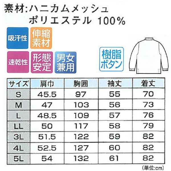 | 特徴 | 1、伸縮素材 2、吸汗性抜群 3、形状安定加工 4、速乾性抜群 5、袖フライス仕様 6、樹脂ボタン 7、胸ポケット付。 8、クリー&豊富なカラーバリエーション! |