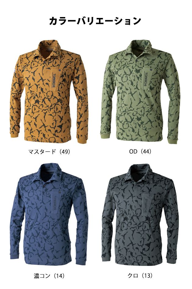 立ちやすくした衿とTORA隠し文字のオリジナル迷彩柄プリント S~4L 寅壱 秋冬作業服 作業着 迷彩柄長袖ポロシャツ 5985-614