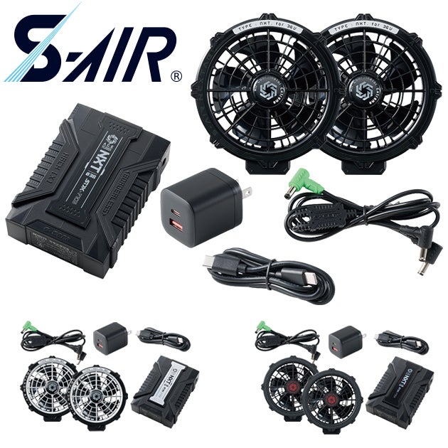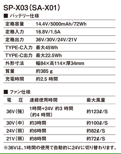 | 【ご注意】 | ●S-AIR専用ウェアに取付け、36V専用バッテリーと専用ファンの組み合わせでご使用ください。 ●SA-126、SA-20、SA-220などその他のS-AIRシリーズとの互換性はありません。 ●他社製品と組み合わせて使用した場合に発生した故障や落下事故については責任を負いません。 ●ご使用前に必ず取扱説明書に記載の内容を最後までよくお読みいただき、注意事項などを十分ご理解の上で正しく安全にご使用ください。 ●商品の仕様、外観は改良のため予告なしに変更することがあります。 ●使用環境温度が高くなると安全のため保護が働き、一時的に電源が落ちますがバッテリー温度が下がると使用できます。 ●[12]リングブラック、[16]ステルスサイクロンはSA-X01でのフルセット販売のみになります(単品販売はありません) |