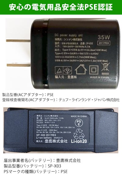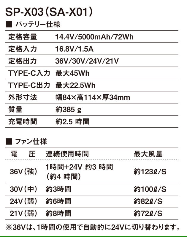 | 【特徴】 | 36V/123lのS-AIR史上最大風量を実現した新規格モデル(全3色) 約2.5時間でフル充電可能な急速充電とスマホ等充電に対応するTYPE-C給電を両立 水洗対応した薄型ファン+防塵防滴対応した大容量バッテリー バッテリー高温時に故障回避する安全保護機能付 【セット内容】 ・36V専用ファン(2個セット) ・36V専用バッテリー ・36V専用二股コード ・36V専用急速充電アダプター ・取扱説明書兼保証書 ■バッテリー仕様 届出事業者名(バッテリー):豊鷹株式会社 製品型番(バッテリー):SA-X01 PSマークの種類(バッテリー):PSE 定格容量:14.4V/5000mAh/72Wh 定格入力:16.8V/1.5A 定格出力:36V/30V/24V/21V TYPE-C入力 最大45Wh TYPE-C出力 最大22.5Wh 外形寸法:幅84×高114×厚34mm 質量:約385 g 充電時間:約2.5時間 ■ACアダプター型番:SW-084250 PSマークの種類(ACアダプター):PSE 登録検査機関名(ACアダプター):テュフ・ラインランド・ジャパン株式会社 ■ファン仕様 電圧/連続使用時間/最大風量 36V(強)/1時間+24V 約3時間(約4時間)/約123L/S 30V(中)/約3時間/約100e/S 24V(弱)/約6時間/約82e/S 21V(弱)/約8時間/約720/S ※36Vは、1時間の使用で自動的に24Vに切り替わります。 |