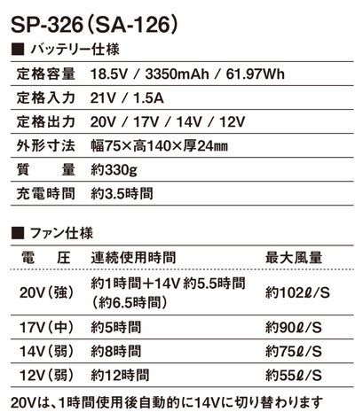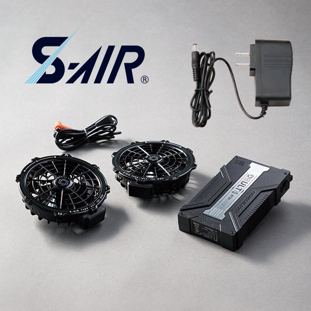 | 【ご注意】 | ●S-AIR専用ウェアに取付け、20V専用バッテリーと専用ファンの組み合わせでご使用ください。 ●SA-X01、SA-20、SA-220などその他のS-AIRシリーズとの互換性はありません。 ●他社製品と組み合わせて使用した場合に発生した故障や落下事故については責任を負いません。 ●ご使用前に必ず取扱説明書に記載の内容を最後までよくお読みいただき、注意事項などを十分ご理解の上で正しく安全にご使用ください。 ●商品の仕様、外観は改良のため予告なしに変更することがあります。 ●使用環境温度が高くなると安全のため保護が働き、一時的に電源が落ちますがバッテリー温度が下がると使用できます。 |