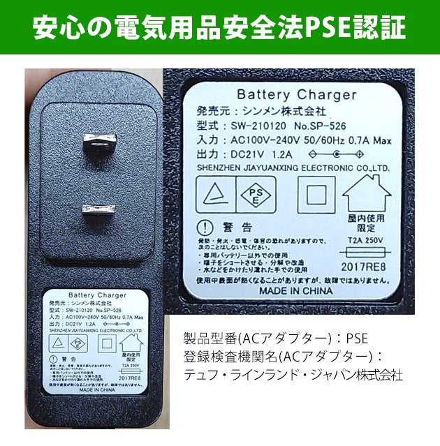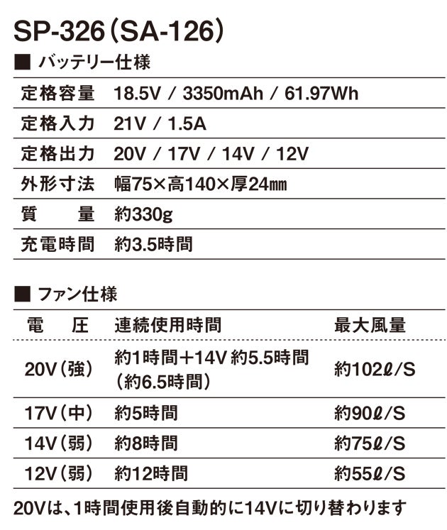 | 【特徴】 | 20V/102lを維持し、ファンを水洗対応?薄型化にアップデート 急速充電に対応し、約3.5時間でフル充電可能 バッテリー高温時に故障回避する安全保護機能付 【セット内容】 ・20V専用ファン(2個セット) ・20V専用バッテリー ・20V専用二股コード ・20V専用急速充電アダプター ・取扱説明書兼保証書 ■バッテリー仕様 届出事業者名(バッテリー):豊鷹株式会社 製品型番(バッテリー):SA-126 PSマークの種類(バッテリー):PSE 定格容量:18.5V/3350mAh/61.97Wh 定格入力:21V/1.5A 定格出力:20V/17V/14V/12V 外形寸法:幅75×高140×厚24mm 質量:約330g 充電時間:約3.5時間 ■ACアダプター型番:SW-084250 PSマークの種類(ACアダプター):PSE 登録検査機関名(ACアダプター):テュフ・ラインランド・ジャパン株式会社 ■ファン仕様 電圧/連続使用時間/最大風量 36V(強)/1時間+24V約5.5時間(約6.5時間)/約102L/S 30V(中)/約5時間/約100e/S 24V(弱)/約8時間/約82e/S 21V(弱)/約12時間/約720/S ※20Vは、1時間の使用で自動的に14Vに切り替わります。 |