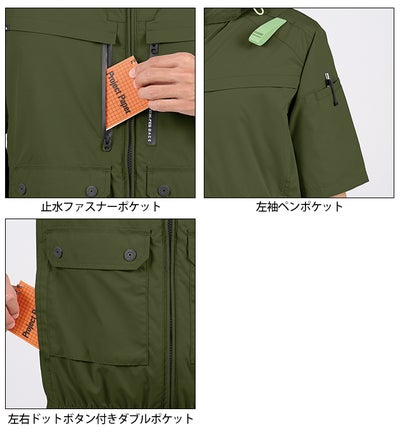 【特徴】 遮熱・UVカット対応の高耐久マイクロリップ裏チタンをユーティティに優れる大型マルチポケットスタイルで仕上げたワークシーンでの使い勝手の良さと風抜けの爽快感を得られるハイポジファンモデル