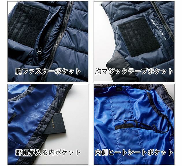 | 特徴 | 軽量感と滑らかな手触り。 高級感のある生地のフード付きおしゃれベスト。 ◆軽量なのにしっかり中綿が入っているからあったかい ◆右胸のマジックテープでワッペン取り付け可能 ◆電熱シート用ポケット付き(背中) ◆反射シート・反射プリント ◆胸ファスナーポケット ◆野帳が入る内ポケット ◆別売りの17009ヒートユニットSと17005モバイルバッテリーを使用することで電熱ベストとして使うこともできます! |