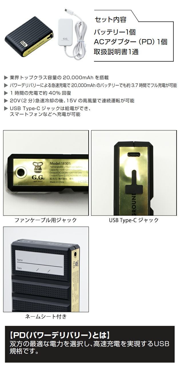 | 【特徴】 | 20,000mAhが生み出すロングドライブとハイパワーが毎日を快適に! パワーデリバリーの採用でさらにはやく急速充電が可能に! ◆業界トップクラス容量の20,000mAhを搭載 ◆パワーデリバリーによる急速充電で20,000mAhのバッテリーでも約3.7時間でフル充電が可能 ◆1時間の充電で約40%回復 ◆20V(2分)の急速冷却の後、15Vの高風量で連続運転が可能 ◆USB Type-Cジャックは給電ができ、スマートフォンなどへ充電が可能 【PD(パワーデリバリー)とは】 双方の最適な電力を選択し、高速充電を実現するUSB規格です。 ・ネームシート付 容量:20,000mAh 出力:8V・12V・15V・20V 充電時間/充電回数:約3.7時間/約1,000回 推奨保管温度:20℃±5℃ ※桑和社内で測定した数値です。 ※20Vは2分後に15Vへ切り換わります。 ※充放電の繰り返しで徐々に蓄電容量が減少します。 【バッテリーの保管方法について】 ・残量0%で保管するとセルが劣化し、次回充電ができなくなる恐れがあります。また、満充電で保管すると、充電容量が減り、駆動時間が少なくなります。 ・約50~80%程度充電し、高温多湿にならない場所で保管してください。 |