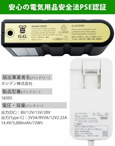 | 入出力(バッテリー):出力(DC):8V/12V/15V/20V 出力(Type-C):5V3A/9V3A/12V2.25A |