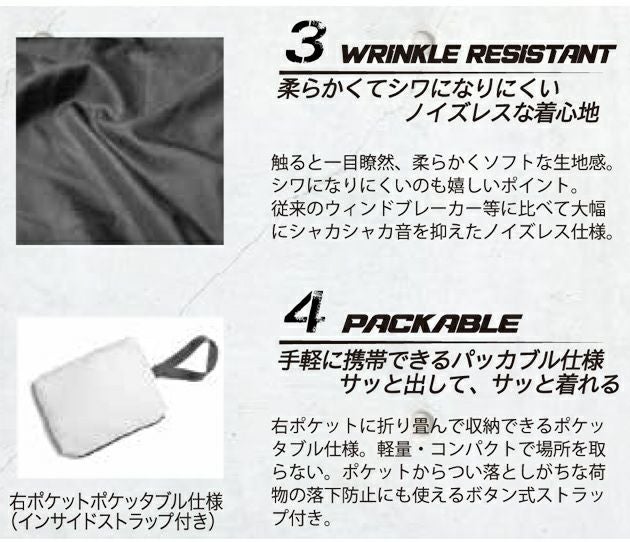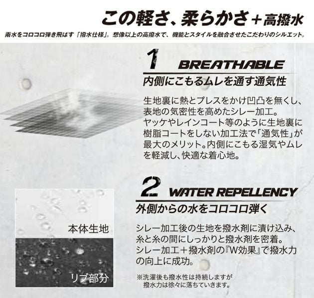| 特徴 | 雨水をコロコロ弾き飛ばす「撥水仕様」想像以上の高撥水で機能とスタイルを融合させたこだわりのシルエット。 ◆内側にこもる蒸れを通す通気性 生地裏に熱とブレスをかけ凸凹をなくし、表地の気密性を高めたシレー加工。 ヤッケやレインコートなどのように生地裏に樹脂コートをしない加工法で、「通気性」が最大のメリット。 内側にこもる湿気やムレを軽減し、快適な着心地。 ◆外側からの水をコロコロ弾く シレー加工後の生地を撥水材に漬け込み、糸と糸の間にしっかりと撥水材を密着。 シレー加工+撥水材の「W効果」で撥水力の向上に成功。 ※洗濯後も撥水性は持続しますが、撥水力は徐々に落ちていきます。 ◆柔らかくてノイズレスな着心地 触ると一目瞭然、柔らかくソフトな生地感。従来のウィンドブレーカーなどに比べて大幅にシャカシャカ音を抑えたノイズレス仕様。 ・ファスナー付きポケット(左右) |