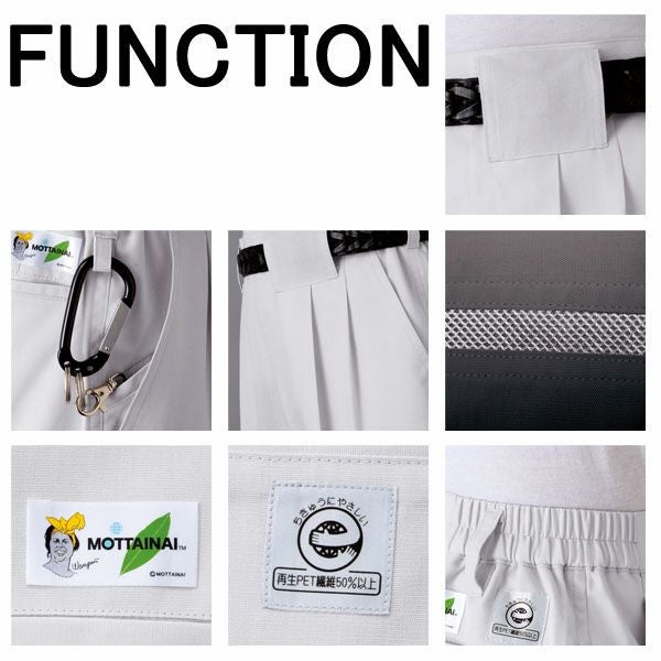 | 特徴 | 1、JIS帯電防止規格合格 2、帯電防止素材使用 3、エコマーク認定 4、再生繊維使用 5、ファスナー樹脂引き手金属 6、苗木約2本分が寄付されます 7、MOTTAINAIネーム 8、脇シャーリング 9、バックルガード 10、カラビナループ&内玉ポケット 11、ツータック 12、反射テープ 13、再生PET繊維60%使用 |