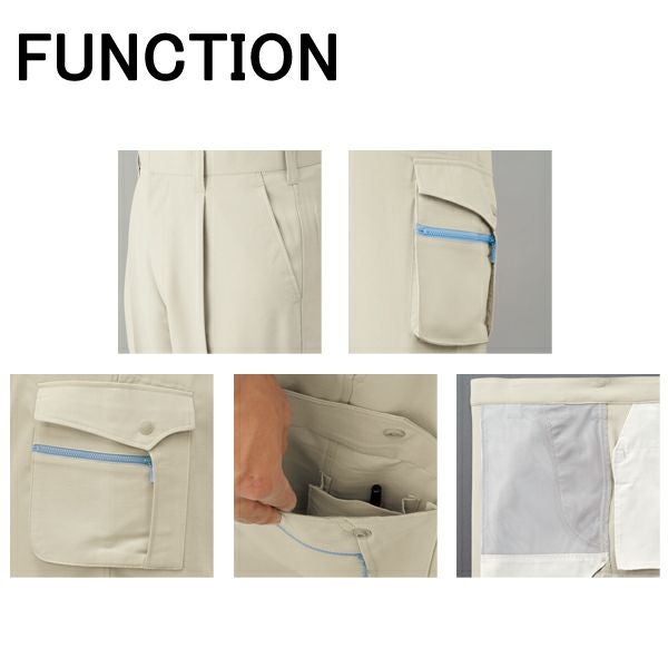 | 特徴 | 1、帯電防止素材使用 2、樹脂ボタン 3、ポケットメッシュ 4、ワンタック 5、携帯電話収納ポケット 6、右サイドダブルポケット(ファスナー付) 7、両脇ポケット(マチ付) |