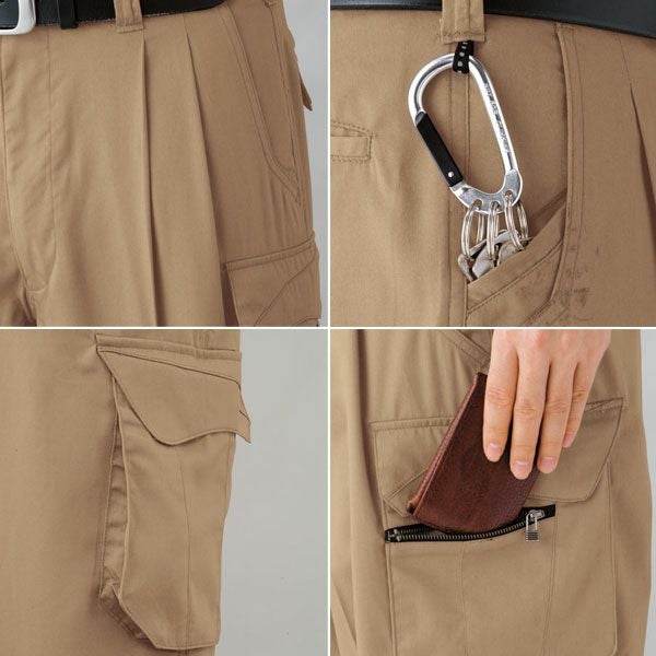 | 特徴 | 1、帯電防止素材使用 2、エコマーク認定 3、ストレッチ 4、吸汗速乾 5、カラビナループ&内玉ポケット 6、ツータック 7、左サイドダブルポケット(ファスナー付) 8、両サイドポケット(マチ付) 9、未利用繊維70%使用 |