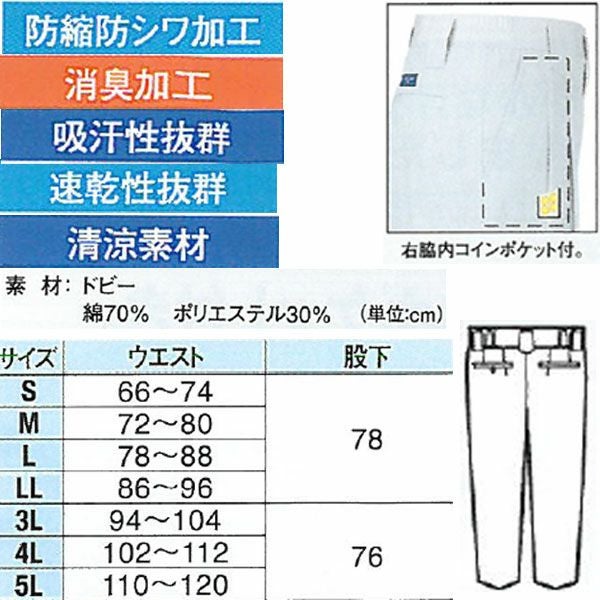 | 特徴 | 1、防縮防シワ加工 2、速乾性抜群 3、消臭加工 4、清涼素材 5、吸汗性抜群 6、福広のベルトループ 7、右脇内コインポケット付 |