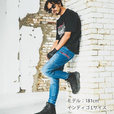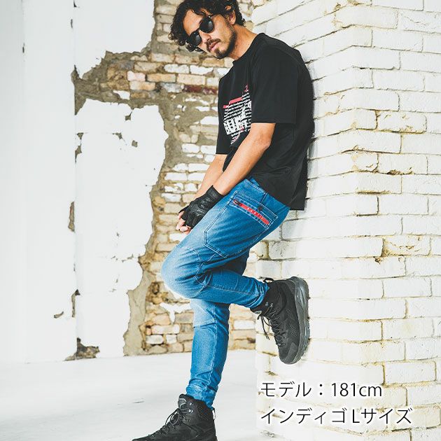| 【素材】 | 4WAYストレッチニット(伸長率40%以上) 吸汗速乾性 通気性 製品洗い、ブラスト加工(45.インディゴのみ) |