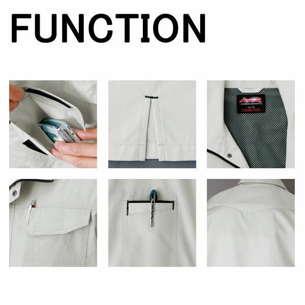 | 特徴 | 1、背当て付(メッシュ) 2、携帯電話収納ポケット 3、左胸ポケット(ペン差し付) 4、左袖ペン差し 5、V字ヨーク 6、脇スリット 7、抗菌防臭 |