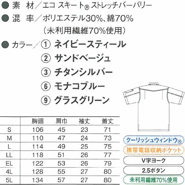 | 特徴 | 1、帯電防止素材使用 2、エコマーク認定 3、ストレッチ 4、吸汗速乾 5、クーリッシュウィンドウ® 6、衿台吸汗速乾メッシュ&衿吊りループ 7、携帯電話収納ポケット 8、左胸ファスナーダブルポケット 9、V字ヨーク 10、反射パイピング付ペン差し 11、シャツ2.5ボタン 12、左胸ポケット(ペン差し付) 13、未利用繊維70%使用 |