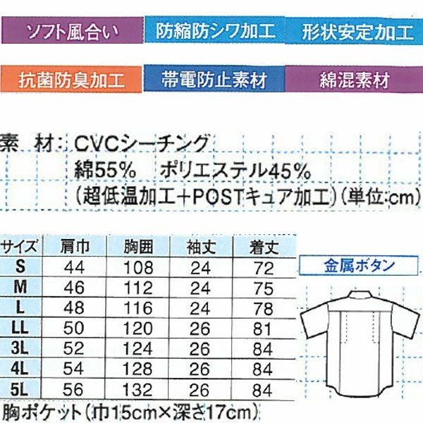 | 特徴 | 1、ソフト風合い 2、防縮防シワ加工 3、形状安定加工 4、抗菌防臭加工 5、帯電防止素材 6、綿混素材 7、超低温加工 8、金属ボタン 9、胸ペン差し付 10、メッシュプリーツロン採用 11、袖ペン差し付 |