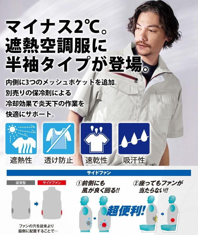 | 【特徴】 | 遮熱空調服に半袖タイプが新登場! 遮熱性のある機能素材が夏の厳しい日差しを軽減! しかもサイドファンタイプだから座ってもファンが当たらない! ◆吸水速乾 ◆透け防止 ◆左胸フラップペン差し ◆両脇ポケット ◆両脇マジックポケット ◆左内側バッテリーポケット ◆左袖ペン差し ◆首元の調整紐で空気の抜けを調整 ◆右胸ファスナーポケット ◆袖口ドットボタンで空気の抜けを調節 この商品は (株)セフト研究所・(株)空調服の特許及び技術を使用しています。 「空調服(R)」は(株)セフト研究所・(株)空調服のファン付きウェア、その附属品、及びこれらを示すブランドです。 「空調服(R)」、「DC空調服」ロゴは、(株)セフト研究所・(株)空調服の登録商標です。 |