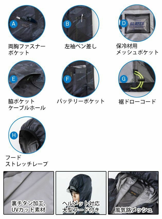 | 特徴 | 裏チタンコーティング・大型フード搭載。 EBAシリーズハイスペックEF(エレクトリックファン)ウェア。 ☆裏チタンコーティング ☆UVカット ☆ヘルメット対応大型フード付き ☆風気路メッシュ ☆両胸ファスナーポケット ☆左袖ペン差し ☆背面内側:保冷材用メッシュポケット ☆両脇ポケット(ケーブルホール付き) ☆バッテリーポケット ☆裾ドローコード ☆ストレッチテープ付きフード |