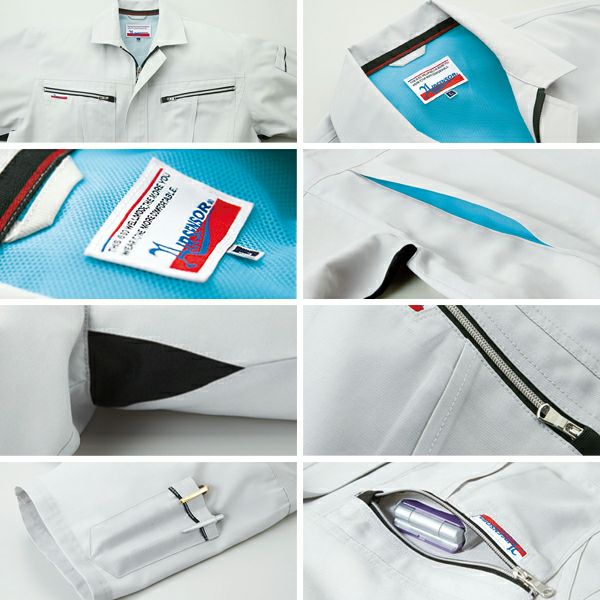 1、右胸携帯ポケット 2、左袖ペン差し 3、ノーフォークメッシュ 4、織ネーム(右胸) 5、衿消臭テープ&肩当メッシュ 6、脇消臭メッシュ 7、袖裹ダーツ2本 8、抗菌防臭 9、制電素材 |