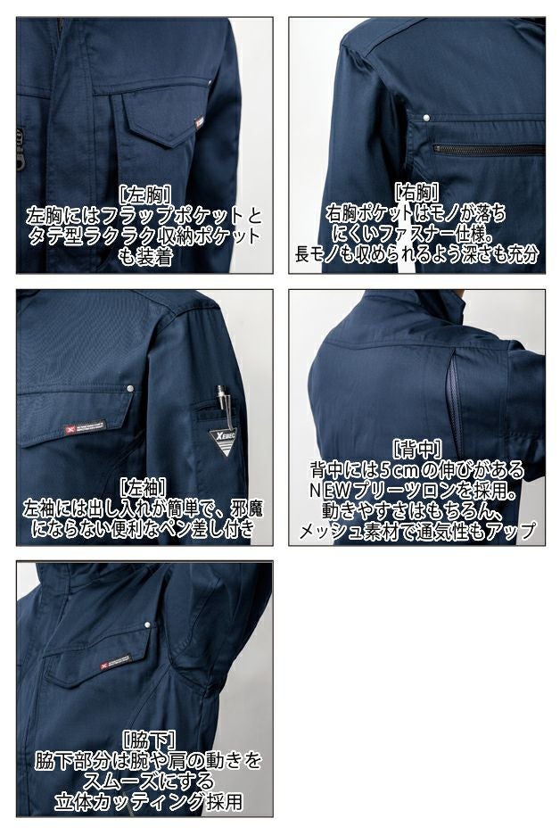 | 特徴 | ◆左胸 左胸にはフラップポケットとタテ型ラクラク収納ポケットも装着 ◆右胸 右胸ポケットはモノが落ちにくいファスナー仕様。長モノも収められるよう深さも充分 ◆左袖 左袖には出し入れが簡単で、邪魔にならない便利なペン差し付き ◆背中 背中には5センチの伸び幅があるNEWプリーツロンを採用。動きやすさはもちろん、メッシュ素材で通気性もアップ ◆脇下 脇下部分は腕や肩の動きをスムーズにする立体カッティング採用 |