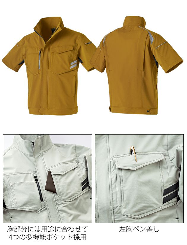 | 特徴 | SDGsに貢献するリサイクル繊維採用。 静電気帯電による事故防止のためのJIS規格もクリア。 軽量で縦にも横にも伸びるストレッチ素材。 ストレスフリーの男女兼用ユニセックス半袖ジャンパーです。 ◆生地は二重織(たて糸とよこ糸を交差させて、2種類の糸を裏と表どちらかに出す肉厚の布生地) ◆胸部分には用途に合わせて4つの多機能ポケット採用 ◆左胸ペン差し ◆左袖ポケット ◆左胸反射テープ ◆肩&左右袖反射パイピング&左右後ろ肩部分には安全を確保する反射材付 ◆裾調整ボタン ◆背ノーフォーク ◆リラックスカット&脇メッシュ ◆リサイクル素材 ◆静電気帯電防止【JIS T8118】 ◆ストレッチ ◆軽量 ◆反射素材 ◆ストレスフリー ◆ストレッチ ◆男女ユニセックス |