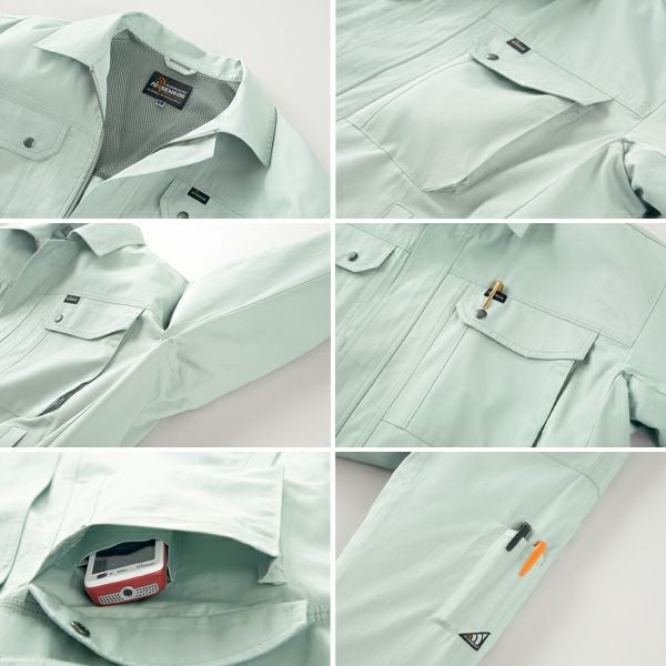 1、背裏メッシュ 2、右胸内携帯ポケット 3、胸ポケットマチ付(外側) 4、左袖ペン差し・織ネーム 5、左胸ペン差し 6、液体アンモニア加工 7、形態安定性 8、ソフト感 9、脇が突っ張らないリラックスカット採用。 |