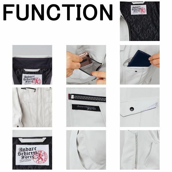 | 特徴 | 1、衿吊りループ 2、ファイアー柄背裏 3、携帯電話収納ポケット 4、手帳の入るWポケット 5、ブランドネーム 6、反射テープ 7、ノーフォークメッシュ 8、サイドラジエーター 9、吸汗速乾メッシュ 10、スリムに見える切り替え 11、ムーンフォーク 12、ダブル胸ポケット 13、帯電防止素材使用 |