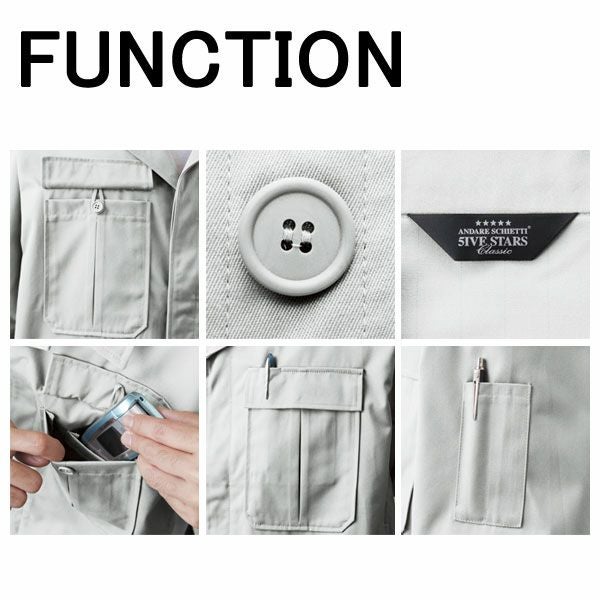 | 特徴 | 1、JIS帯電防止規格合格 2、帯電防止素材使用 3、エコマーク認定 4、抗菌防臭 5、防汚加工 6、携帯電話収納ポケット 7、デオドラント加工ネーム 8、再生PET繊維65%使用 9、左胸ペン差し 10、左袖ペン差し 11、ボタン止めループ 12、つや消しボタン 13、胸ポケット 左(巾13cm×深さ18cm) |