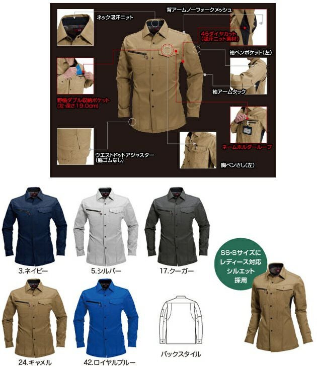 | 特徴 | ・高品質な日本製ドビークロス(校倉構造)点接触清涼素材を使用 ・優れた通気性と汗のべたつき解消など夏の暑さに対応 ・野帳が入る大型マルチポケット付 ・女性専用デザインを採用した男女ユニセックスシリーズ ・腕の上げ下げがスムーズな独自の脇ダイヤカット ・製品制電JIS T8118適合品 |