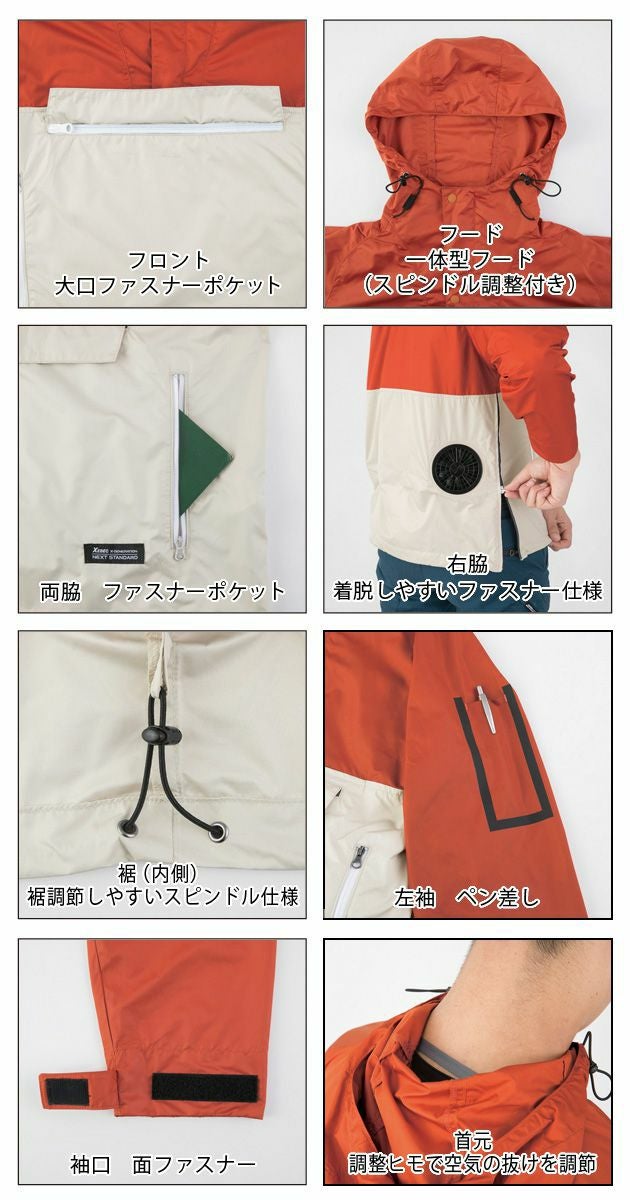 | 特徴 | ワークにもレジャーにも使えるアノラックタイプ新登場! ワークシーン以外にレジャーでも快適に! 単色とツートーンカラーのラインナップでシーンに合わせてオシャレに熱中症対策を。 フード付きで日焼け対策もバッチリ! ◆シャープなシルエット 身頃の膨らみを抑えたシャープなシルエット。 ◆普段着感覚で着られるスグレモノ! ボトムを選ばないシンプルなデザインは男女問わず着用頂けます! ◆フロントのデカポケットが便利 ◆フロント 大口ファスナーポケット。 ◆フード 一体型フード(スピンドル調整付き) ◆両脇 ファスナーポケット。 ◆右脇 着脱しやすいファスナー仕様。 ◆裾(内側) 裾調節しやすいスピンドル仕様。 ◆左袖 ペン差し。 ◆袖口 面ファスナー。 ◆首元 調整ヒモで空気の抜けを調節。 ◇◆ご注意◆◇ バッテリーとファンユニットは別売りとなります。 空調服着用時は、空調服専用のファン、バッテリーを必ずご使用ください。 ◎ご使用前に必ずファンユニット、およびバッテリーの取扱説明書に記載の内容を最後までよくお読みいただき、ご使用上の注意事項、本商品の能力、使用方法など十分ご理解のうえで、ご使用前に動作確認を行い、正しく安全にご使用くださるようお願いいたします。 |