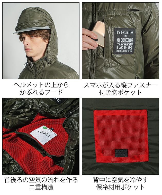 | 特徴 | アイズフロンティアが放つE.F.ウェアの新たなる世界観。 上質を極めたその質感は妥協を知らない物づくりの結晶。 ◆アイズフロンティアが表現するエレガント&リッチな世界観が、ワークシーンに異彩を放ちます。 ◆撥水機能も併せ持つ超軽量高密度ナイロン素材を使用。限界まで無駄をそぎ落としたシンプルなデザインに大胆なロゴプリントをプラス。 ◆重量感のあるダイキャスト製スピンドルストッパーや金属性ファスナー等、各資材にも拘り至高のリッチ感を演出。その世界感はワークシーンのみならず、様々なシーンに対応します。 ◆表面のシレ加工により高い密封性と適度な引裂き強度を併せ持ちエアロフロー効果を最大限に高めます。 ◆背面首ぐり部分の特許取得構造により、首もとからの安定した風の排出を実現。 ◆エレガントなルックスも、フルハーネス対応モデルでハードワーカー様にも対応可能 ◆ファスナーやドット釦等は国産YKK社製を使用。細部にまで品質に拘っています。 ・ヘルメットの上からかぶれるフード(視界広め) ・首後ろの立体構造で衣服内を風が駆け巡る ・スマホが入る縦ファスナー付き胸ポケット ・首後ろの空気の流れを作る二重構造 ・滑らかな質感で極上の着心地を実現 ・背中に空気を冷やす保冷材用ポケット ・ハーネス用フック掛け ・ファスナー付きランヤード取り付け口 ※AIRCYCLONESYSTEMご着用の際は、必ず専用のCOOLBLASTのファン・バッテリーをご使用ください。 |