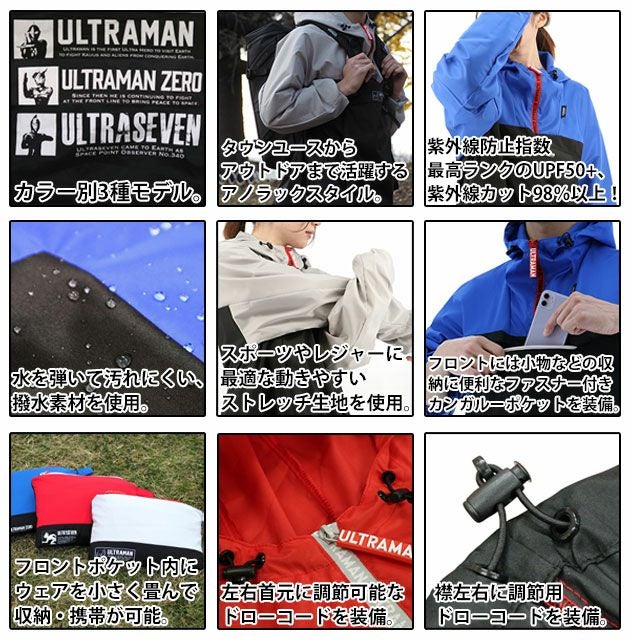 | 特徴 | 変身しろ、ウルトラな自分へ。 「ウルトラマン」「ウルトラセブン」「ウルトラマンゼロ」モデルのUVポケットダブルパーカー! ◆紫外線対策に便利なUVカット98%を実現。 ◆タウンユースからアウトドアシーンでも活躍する、ポケッタブル仕様のアノラックスタイル。 ◆ストレッチ性と撥水性を兼ね備えた生地を使用し、動きやすく汚れにくい。 ◆フロントには小物の収納に便利なファスナー付カンガルーポケットを装備。 ◆フロントポケット内にウェア本体を小さく畳んでコンパクトな収納・形態が可能。(ポーチ型に変身!) ◆首元、裾部分にドローコードを装備し、サイズ調整が可能。 |
