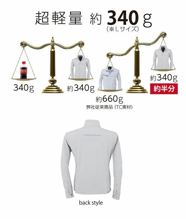 | 特徴 | 重さが通常のTC素材の約半分!"超軽量"シリーズ。 伸長率タテ・ヨコ20%以上のストレッチ素材でノンストレスな着用感。 ・表面突起付属なし ・帯なし仕様 ・サイドベンツアジャスター ・袖口アジャスター ・野帳も収まる両胸フラップインポケット ※右胸ファスナーポケット(巾17cm×深さ18cm) |