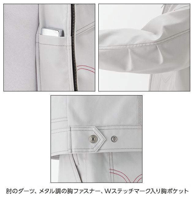 | 特徴 | オーソドックスなアメリカンスタイルと最新素材の融合! ◆胸ポケットから伸びる立体的なV字状シーム(切り替え)と、ウエスタン背ヨークというオーソドックスなスタイルながら伸縮率約7%のT/C素材! ◆肘のダーツ、メタル調の胸ファスナー、Wステッチマーク入り胸ポケットのユーティリティ・ブルゾン! ◆オールシーズン対応! ◆日本製生地 ◆帯電防止素材 ◆ストレッチ素材(伸縮率約7%) ◆フロント:金属ファスナー ◆右胸:樹脂ファスナー ◆左胸:金属ドットボタン ◆内ポケット(左身頃) |