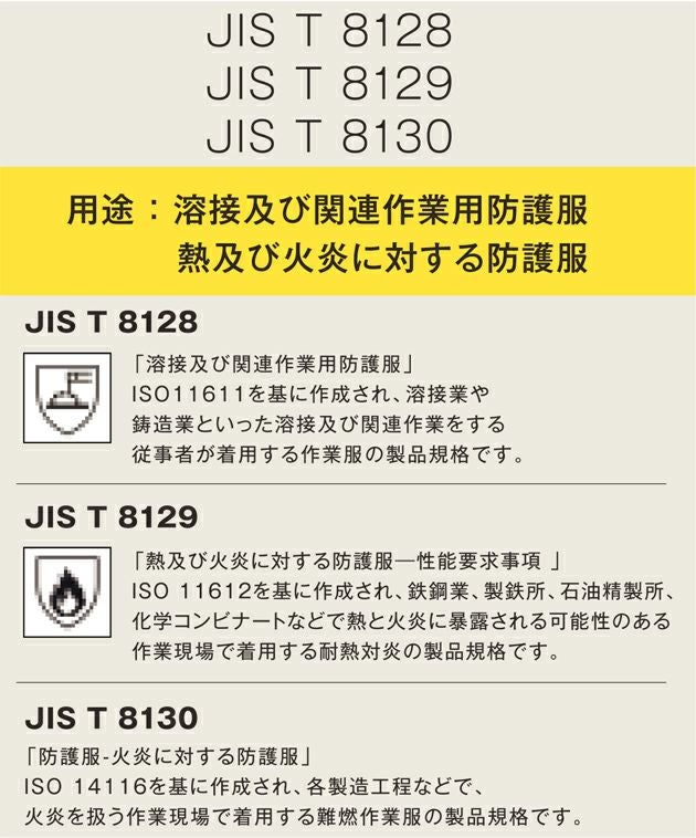 | 【ご注意】 | 難燃・防炎作業服とは、「火がついても燃えにくい」作業服のことです。 不燃ではありません。 本製品の不適切な使用に関して、当社は一切の責任を負いかねます。 記載の分類性能を有していますが、安全性を保証するものではありません。 可燃物質のような危険物が存在する場所では、着脱しないでください。 大きな損傷を受けるような洗濯はお避けください。 |
