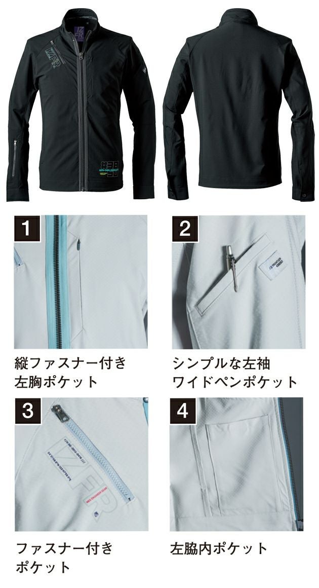 | 【特徴】 | Destination of exploration・・・ 飽くなき探求の果てにたどり着いた一つのかたち。 その洗練されたスタイリッシュモデルに秘められたポテンシャルが今覚醒する。 ◆独特な織り構造を採用したワイルド感溢れる二重織素材を採用。 色の濃淡をさりげなく表現し、高級感と先進性を兼ね備えた独特のルックスを実現します。 ◆生地裏面の絶妙な凹凸構造と素材特有のサラサラタッチが汗ばむ季節に不快感の少ない着用感を実現します。 ◆溶剤浸透加工による快適な吸水速乾性能を発揮し更なる快適感アップを実現します。 ◆ポリウレタン糸を使用し、伸長率タテ約26%・ヨコ約15%、伸長回復率(1時間後)約87%の適度な全方向ストレッチ性能を有し、ストレスのない快適な動き易さと安定感のあるシルエットキープを実現します。 ◆春夏シーズンを前提に開発された素材も一般基準を凌ぐ引裂き強さ(タテ約19N・ヨコ約26N)を実現。 抗ピリング性能や抗スナッグ性能、表面摩擦強さ等その他各項目も高い数値を測定した高堅牢性モデル。 ◆着用時やお洗濯後のシワも少なく、手間いらずのイージーメンテナンスも大きな魅力。 ◆シーンを選ばない先進的なシャープなデザインに、アイズフロンティアならではの厳選されたレタリングプリントをプラス。 さり気ないリッチ感を演出します。 ◆高級感溢れる特殊メッキを施したジャケットフロントビスロンファスナーや国産YKK社製ドット?等を採用し、細部にまで拘りを追求しています。 ・縦ファスナー付き左胸ポケット ・シンプルな左袖ワイドペンポケット ・ファスナー付きポケット ・左脇内ポケット |