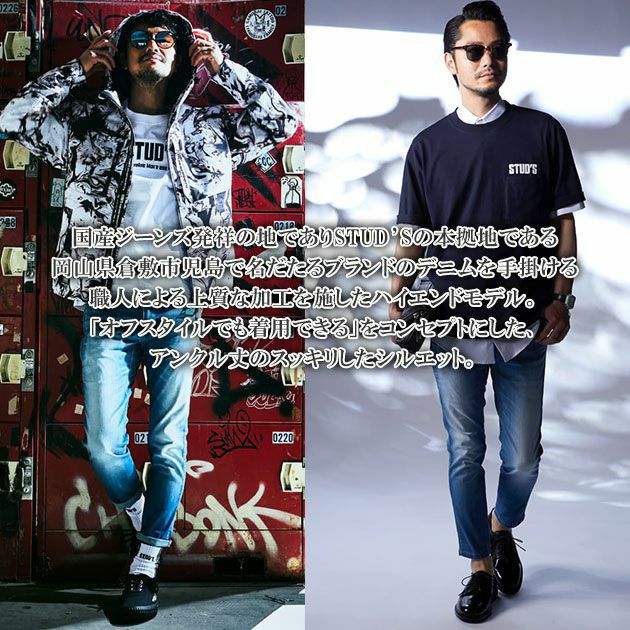 | 特徴 | 「STUD'S(スタッズ)」。 それは「大人の作業着」。 ジーンズの街「児島」で職人による加工を施したワンランク上のデニムパンツ登場。 オフスタイルでも着用できる上品な加工とデザインにこだわった1着。 スタイリッシュに履けるアンクルパンツが出来上がりました。 ◆スマホも収納できる左サイドファスナーポケット ◆バックポケットは多彩な4ポケット仕様 |