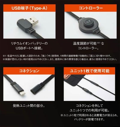 | 【ご注意】 | ※こちらは発熱ユニットのみの販売です。ウェア、バッテリーは別売です。 ※ご使用については、取扱説明書を事前に必ずお読みください。 |