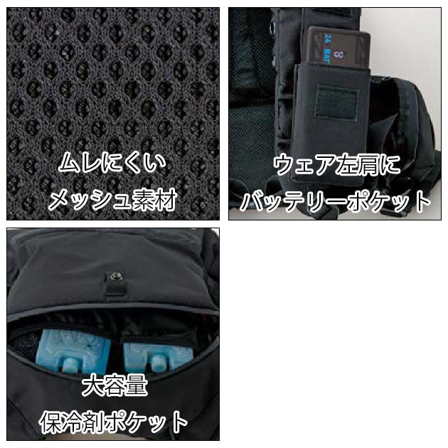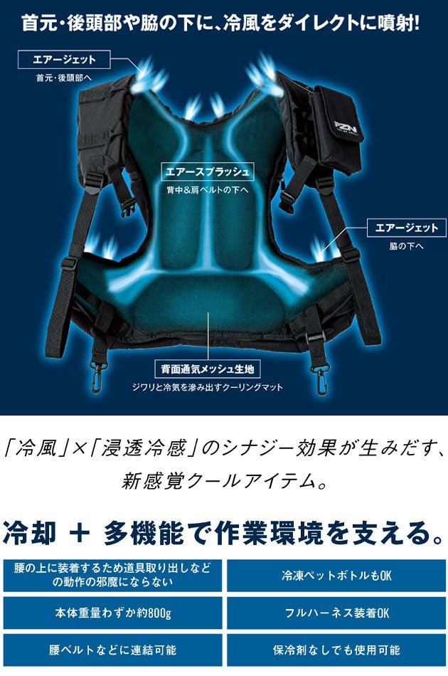 | 【特徴】 | 空調作業服と保冷ベストが合体! 「冷風」×「浸透冷感」という新感覚! 今までにない新たなるクールアイテムが登場! ◆空調風神服の新たなスタイル「冷風ダイレクト噴射」! 首元や後頭部、脇の下に穴が開いたベストだから強力な冷風がダイレクトに噴射されます。 冷やしたい場所へファンの風がダイレクトに当たるから涼しい! ◆背中部分もひんやり!「エアースプラッシュ」! ファンから取り込んだ風はベストの背中部分と肩ベルトに下へ流れ込みます。 さらに付属の保冷剤を背中に搭載すれば背中部分がもっとヒンヤリします! ◆ジワリと冷気がにじみ出る!背中クーリングマット ◆背中部分は通気性の良いメッシュでムレにくい ◆ウェアの左肩にバッテリー用ポケットを配置(可動式) ◆背中部分保冷剤ポケット(冷凍ペットボトルもOK・保冷剤なしでも使えます) ◆フルハーネス装着可能 |