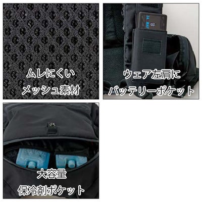 | 【ご注意】 | 空調風神服ファン・バッテリーが必要です。 必ず対応するファンバッテリーを組み合わせてご使用ください。 ご使用の際は取扱説明書をお読みいただき正しくご使用ください。 |